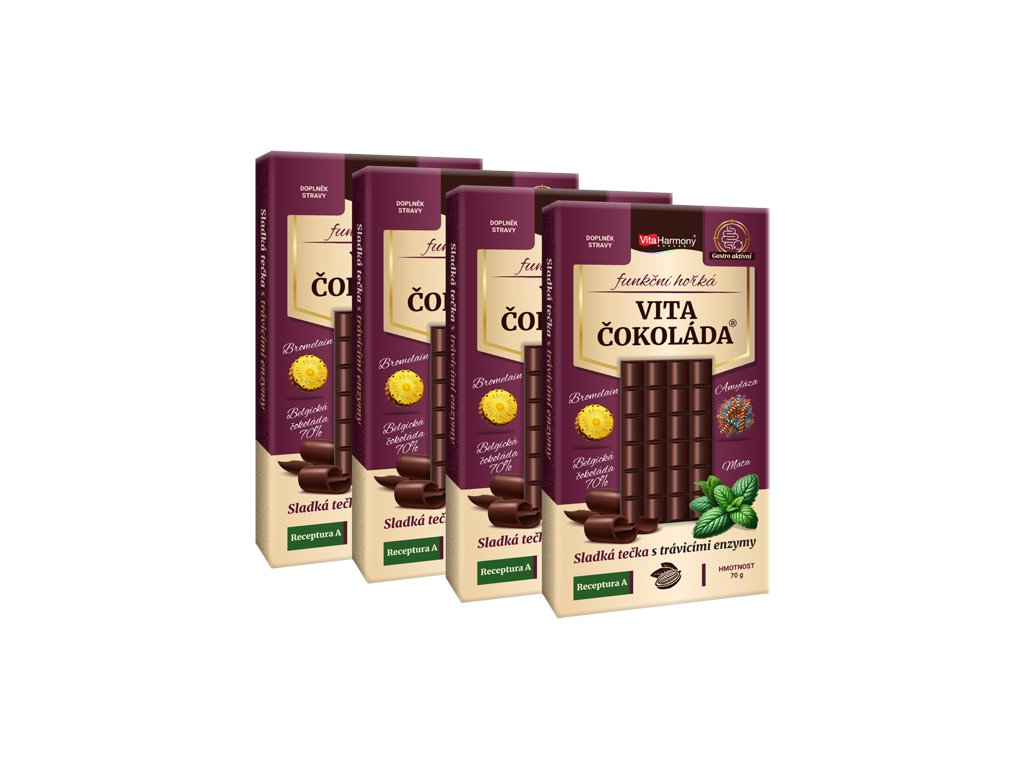4 ks za cenu 3 ks -Funkční VitaČokoláda® - Receptura A - (bromelain, amyláza, máta) - hořká, 70g