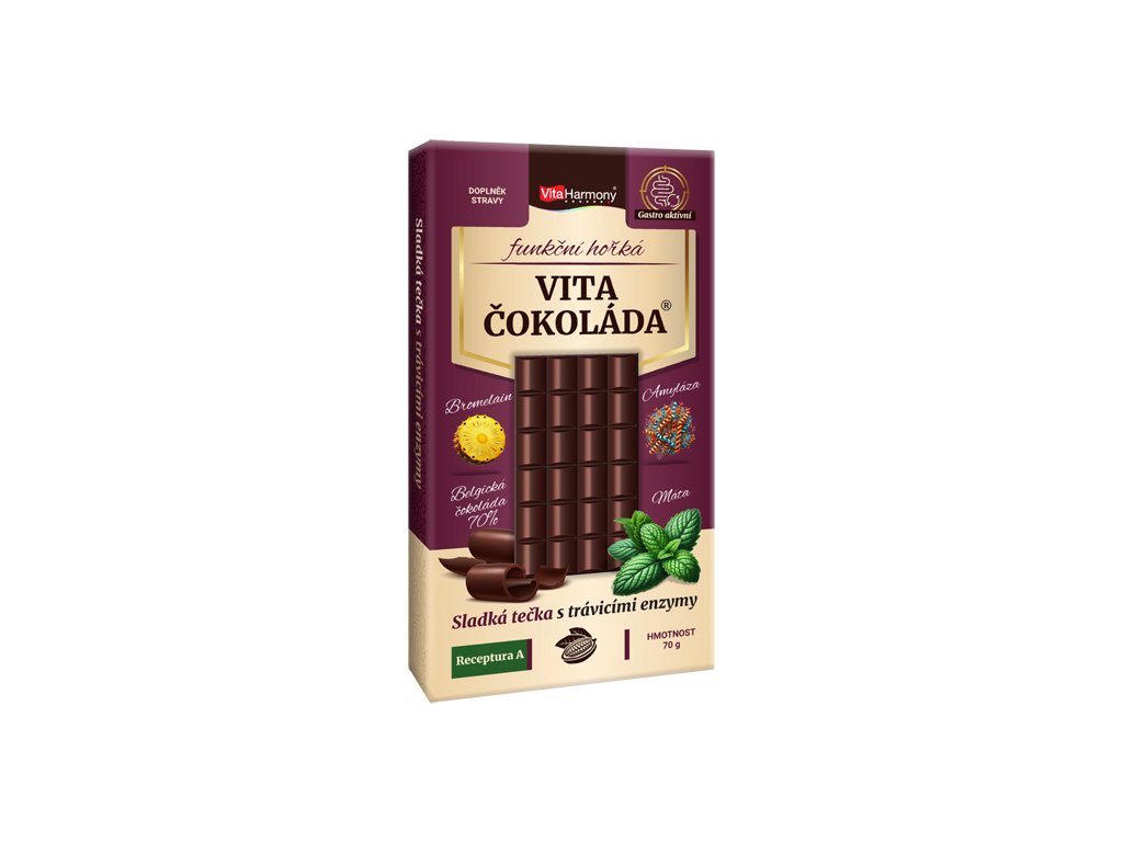 Funkční hořká VitaČokoláda® kombinuje bohatou chuť 70% čokolády s pečlivě vybranými látkami, které podporují trávení. Tato čokoláda nejenže uspokojí chuťové buňky, ale také přináší zdravotní výhody díky obsaženým složkám, jako jsou bromelain, amyláza a máta peprná.
