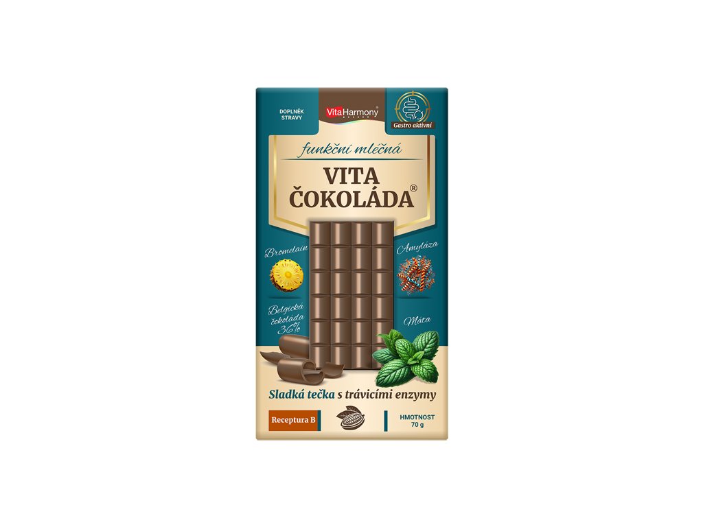 Funkční mléčná VitaČokoláda® kombinuje bohatou chuť 56% čokolády s pečlivě vybranými látkami, které podporují trávení. Tato čokoláda nejenže uspokojí chuťové buňky, ale také přináší zdravotní výhody díky obsaženým složkám, jako jsou bromelain, amyláza a máta peprná.