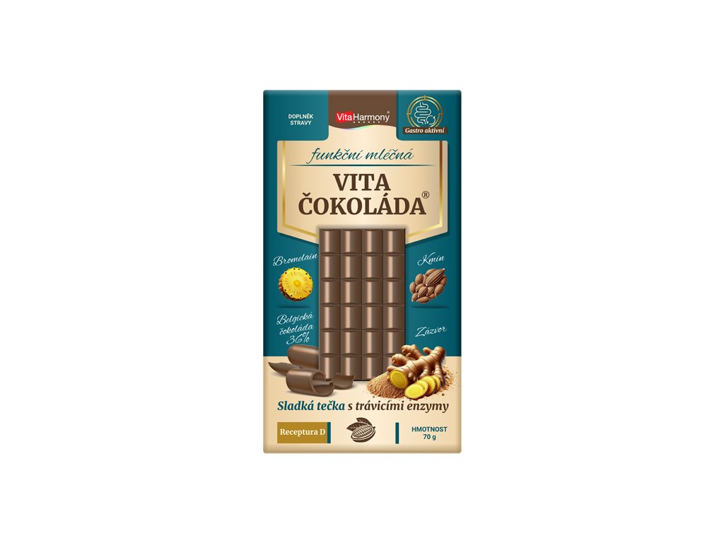 VitaČokoláda® spojuje jemnou chuť mléčné čokolády s 36% podílem kakaa a funkčními rostlinnými složkami – zázvorem, kmínem a enzymem bromelainem. Tyto přírodní ingredience jsou ceněny pro své tradiční využití v péči o zažívání a komfort po jídle.VitaČokoláda® spojuje jemnou chuť mléčné čokolády s 36% podílem kakaa a funkčními rostlinnými složkami – zázvorem, kmínem a enzymem bromelainem. Tyto přírodní ingredience jsou ceněny pro své tradiční využití v péči o zažívání a komfort po jídle.