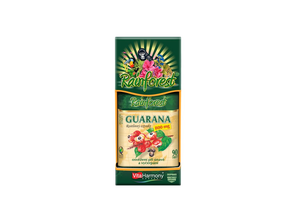 Guarana 800 mg z řady Rainforest® - Extrakt ze semen amazonské liánovité rostliny Guarany (Paullinia cupana) je pro své povzbuzující účinky proslulý. Obsahuje guaranin, kofein, třísloviny, saponiny a bioflavonoidy. Guarana napomáhá překonávat únavu a pocit vyčerpání, pozitivně působí na svalový a nervový systém, při menstruaci či proti pocitu hladu. Guarana je vhodná v období se zvýšenou psychickou aktivitou s nutností maximální koncentrace. Dodá energii a chuť do života.