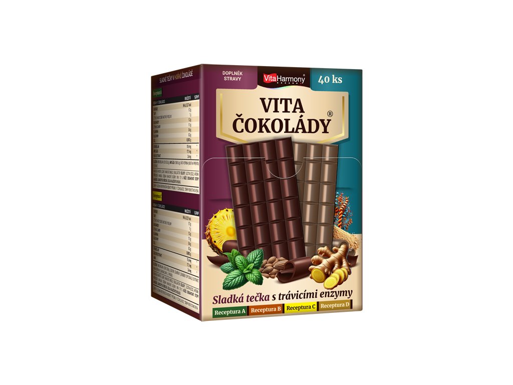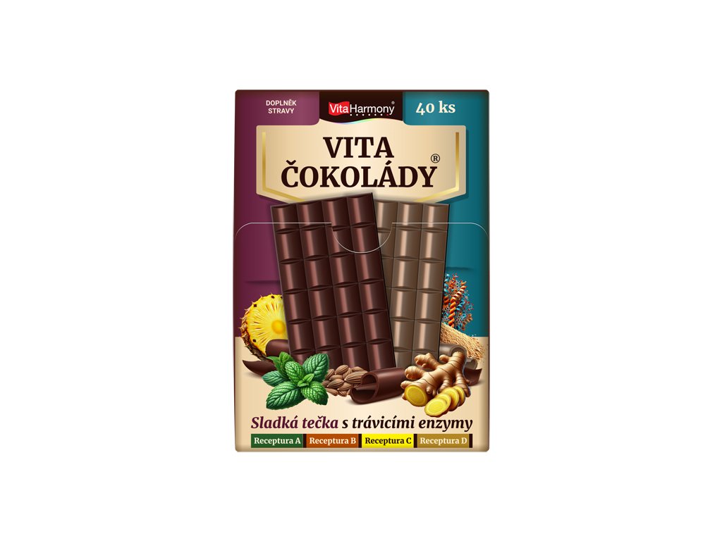 VitaČokoláda® kombinuje jemnou chuť 36% mléčné čokolády s pečlivě vybranými složkami – enzymy bromelainem a amylázou a aromatickou mátou peprnou. Tato výjimečná kombinace je ideální pro každodenní podporu trávení po jídle, zejména při konzumaci bílkovin a sacharidů, které mohou být pro zažívání náročnější.