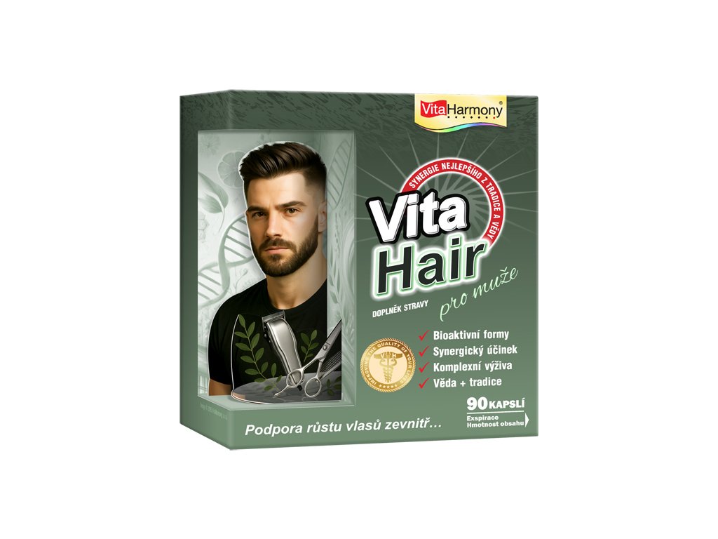 VitaHair pro muže je moderní doplněk stravy navržený pro cílenou vnitřní výživu vlasů, pokožky hlavy a celkovou vitalitu, která doplňuje běžnou kosmetickou péči. Obsahuje synergickou kombinaci MSM, L-cysteinu, L-methioninu, a křemíku z bambusu – látek nezbytných pro přirozenou tvorbu keratinu, základní stavební složky vlasů. Tento výživový komplex je doplněn o vitaminy, minerály a extrakty, které podporují odolnost, pevnost a lesk vlasů.
