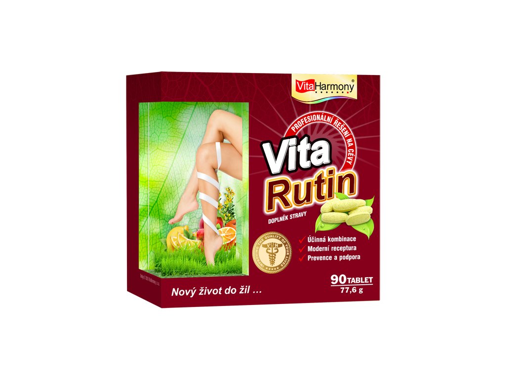 VitaRutin je zaměřený na komplexní podporu normální funkce krevních cév a celého kardiovaskulárního systému. Jeho účinné látky, rutin, diosmin, hesperidin a vitamin C, společným působením navzájem podporují své účinky a přispívají k přirozené funkci srdce a cév. Doplněk stravy VitaRutin lze doporučit jako podpůrný prostředek při léčbě křečových žil, bércových vředů, hemoroidů nebo dalších cévních potíží. Jednou z hlavních účinných látek VitaRutinu je přírodní složka rutin, který přispívá k optimální stavbě a funkci cévních stěn. Rutin se přirozeně vyskytuje v některých potravinách, např. v pohance, což je přirozeně bezlepková obilovina s výborným nutričním obsahem. Díky obsaženým aktivním látkám pohanka obecná podporuje normální funkci kardiovaskulárního systému – to znamená, že přispívá k přirozené funkci našeho srdce a cév. Další aktivní látky, které přípravek VitaRutin obsahuje jsou bioflavonoidy diosmin a hesperidin. Tyto látky, společně s vitaminem C, podporují přirozenou funkci kardiovaskulárního systému. Vitamin C přispívá k normální tvorbě kolagenu pro normální funkci krevních cév, což je velmi důležité pro přirozenou funkci celého kardiovaskulárního systému. Doplněk stravy VitaRutin je ideální volbou pro všechny, kteří mají potíže s cévami nebo srdečně cévním systémem, nebo patří mezi rizikové skupiny. Velmi vhodné je i jeho preventivní užívání pro osoby, které mají predispozice ke vzniku křečových žil nebo dalších cévních onemocnění. Přípravek VitaRutin je vhodný i k dlouhodobému užívání. Pro maximální podporu léčby Vašich zdravotních potíží doporučujeme zaměřit se na zdravou stravu, aktivní životní styl s dostatkem pohybové aktivity a pravidelné kontroly u Vašeho ošetřujícího lékaře.