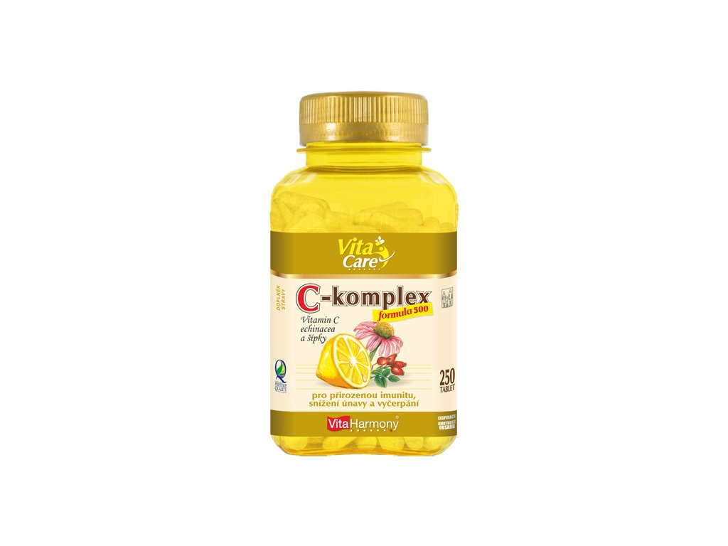 C-komplex formula 500 - Obsahuje jedinečnou kompozici tří účinných látek: vitamin C, echinaceu a bioflavonoidy ze šípků, které se efektivně synergicky podporují. Vitamin C přispívá k normální funkci imunitního systému. Účastní se ochrany buněk před oxidativním stresem, struktur cév, chrupavek, dásní a zubů. Snižuje míru únavy a vyčerpání, přispívá k normální psychické činnosti a činnosti nervové soustavy.