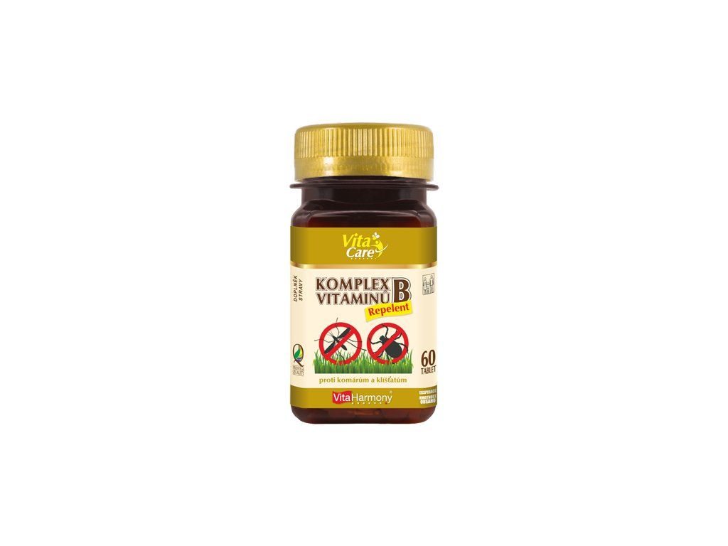 Komplex vitaminů B Repelent - Repelent v tabletové formě se zvýšeným množstvím vitaminu B1. Přípravek pokrývá potřebu i ostatních vitaminů skupiny B a je tradičně využívaný proti hmyzu, zejména proti komárům a klíšťatům. Jedná se o vitaminy rozpustné ve vodě, proto se bezpečně vylučují močí nebo potem, a tím je následně hmyz odpuzován. Spotřeba těchto vitaminů nadměrně stoupá při jakémkoliv stresu. Užívá se nejvhodněji v období od května do konce září. B komplex se doporučuje užívat u vody, na dovolené nebo při sportu.