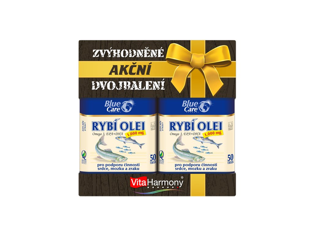 Rybí olej 1000 mg - Želatinové tobolky obsahují olej ryb žijících v arktických vodách. Olej je bohatým zdrojem esenciálních omega-3 nenasycených mastných kyselin, a to zejména kyseliny eikosapentaenové (EPA) a dokosahexaenové (DHA). DHA přispívá k udržení normálního stavu zraku a činnosti mozku. EPA a DHA přispívají k normální činnosti srdce. Příznivého účinku se dosáhne při přívodu 250 mg EPA a DHA denně. Vhodný je současný příjem antioxidantů, například vitaminu E.